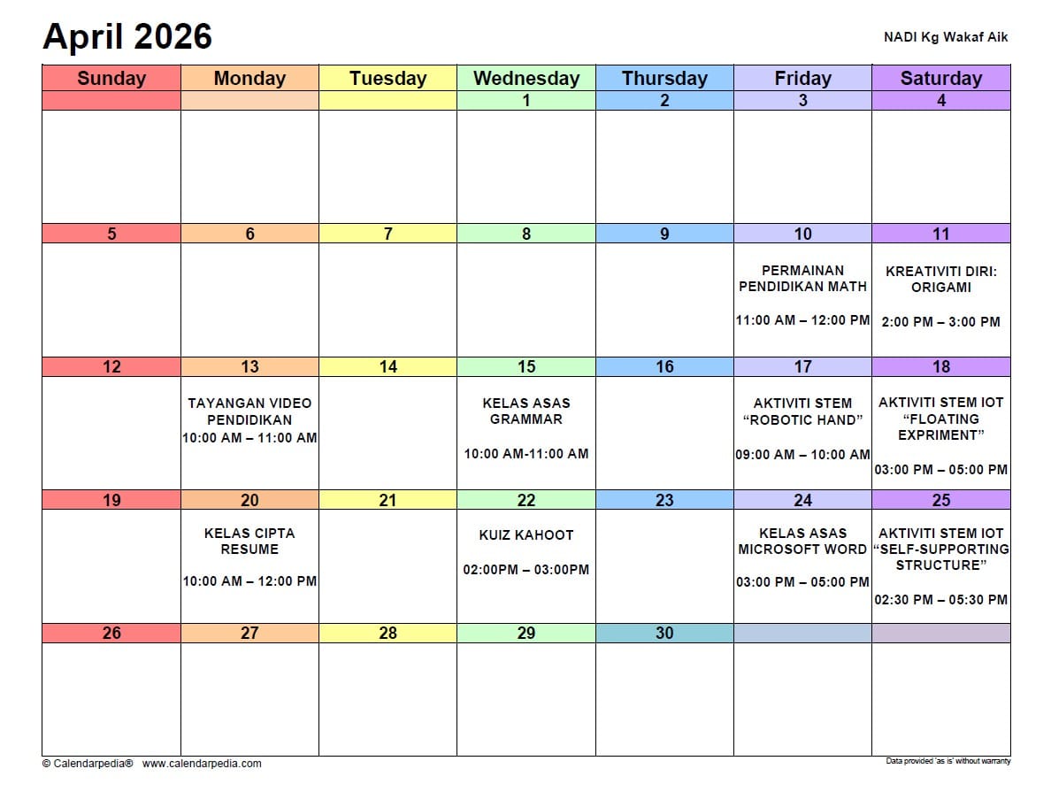 JADUAL AKTIVITI PUSAT SEBARAN MAKLUMAT NASIONAL (NADI) KAMPUNG WAKAF AIK BAGI BULAN APRIL 2026 ADALAH SEPERTI BERIKUT